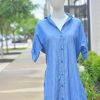 A 40-inch long, button-front shirt dress crafted from breathable handloom cotton—designed with kimono sleeves, side pockets, and a one-size-fits-most silhouette for easy, elegant everyday wear.