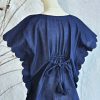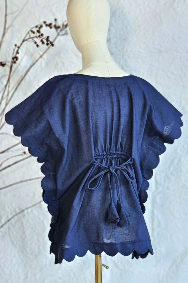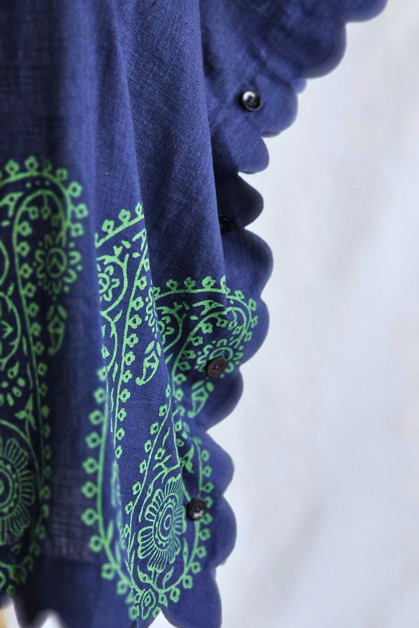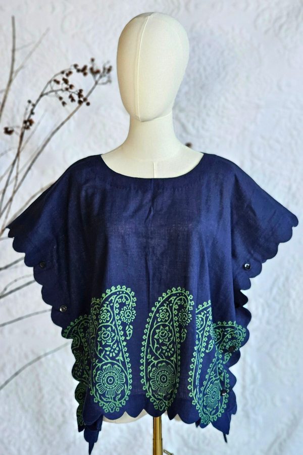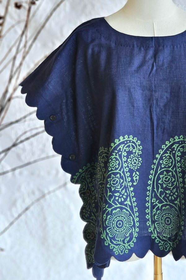 A breathable hand block printed linen top for women designed for comfort and everyday style. Features scallop detailing, adjustable back drawstrings, and side buttons for versatile styling.