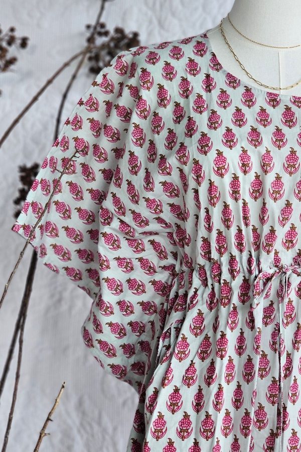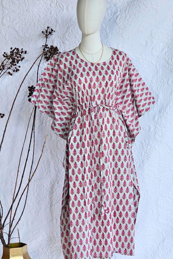 A free-flowing kaftan in 100% cotton, hand block printed and designed with an adjustable waist for effortless comfort and self-expression.