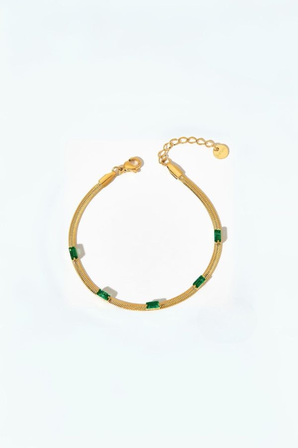 | Design Details | Sleek gold snake chain with emerald baguette-cut stones |